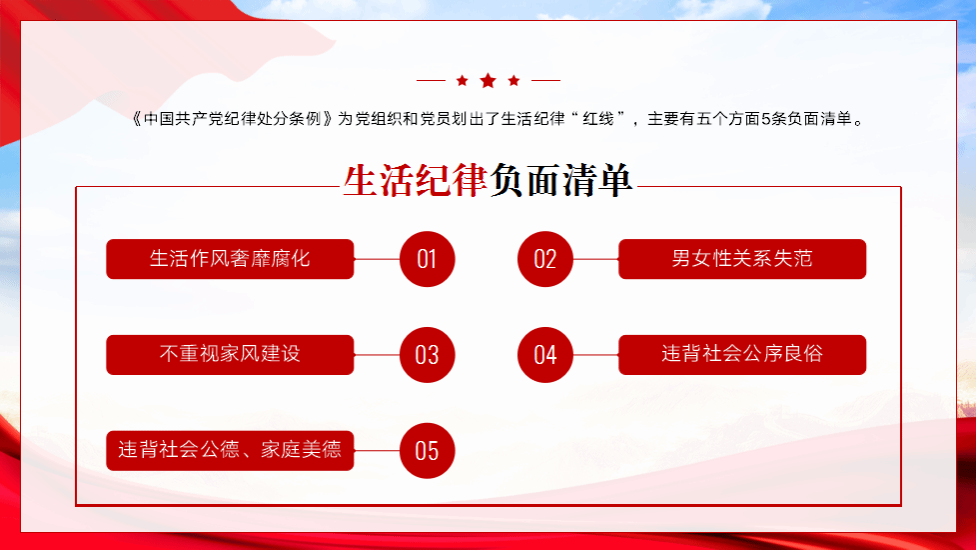 生活纪律是党员干部在日常生活和社会交往中应当遵守的行为规则,涉及党员干部的个人品德、家庭美德和社会公德等各个方面,关系党的作风和形象。生活作风奢靡腐化,男女关系失范,不重视家风建设,违背社会公序良俗,违背社会公德、家庭美德,是生活纪律不可触碰的五条“红线”。党员干部“八小时之外”生活是“八小时之内”工作的延伸,共产党员的身份、义务、纪律标准等并不随着时空的变化而变化。生活作风不是小事,生活纪律更不可小视。广大党员干部知纪明忌,严明生活纪律,心有所畏,言有所戒,行有所止,自觉锤炼道德品质,塑造党员队伍的良好形象。