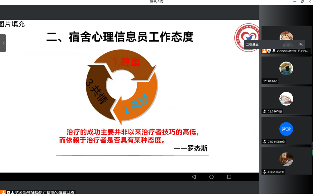 心理委员是学校心理健康工作的隐蔽战线,是开展大学生心理健康教育的需要。在培训中,庄培勋老师指出,伴随着频发的疫情扰乱大家的生活学习节奏,随之而来的不良情绪需要宿舍心理信息员重视和引导,心理信息员应当掌握应有的工作态度和沟通技巧,向有困扰的舍友同伴提供我们的帮助。