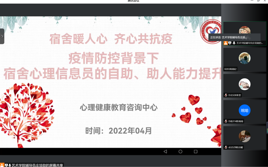 为提升宿舍心理信息员的自助、助人能力,增强心理健康教育的针对性和实效性,4月7日,我院于线上举办了主题为“宿舍暖人心,齐心共抗疫”的线上宿舍心理信息员培训,针对近期频发的新冠疫情引发的一系列有关的心理问题展开讨论。本次培训由学院心理辅导站站长庄培勋老师主讲。
