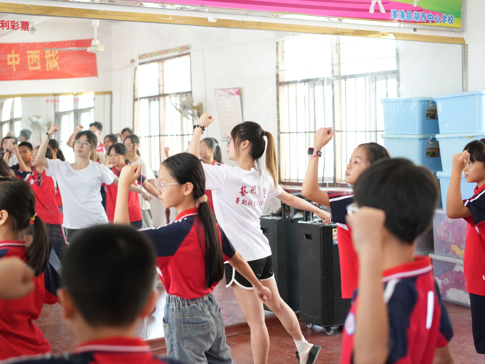 舞蹈组的实践队员们带领小营员们一起学习了头部、肩部、压腿、勾脚拉伸、踢腿等舞蹈基础动作。在优美、欢快的旋律里,实践队员们亲自示范、手把手教学,小营员们跟随节奏、舞动身姿,直观全面地了解、体验和学习舞蹈,深刻感受舞蹈的魅力。