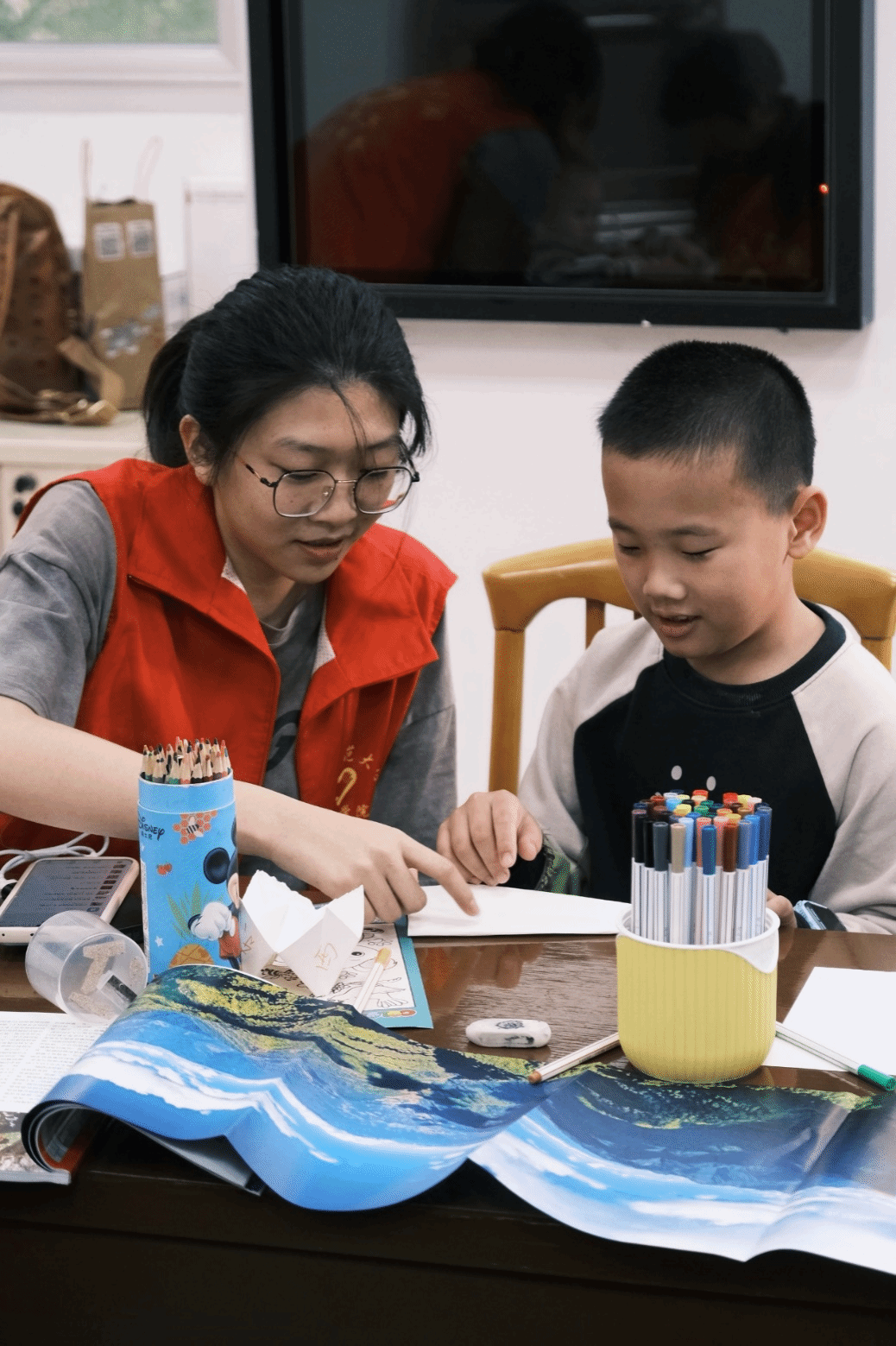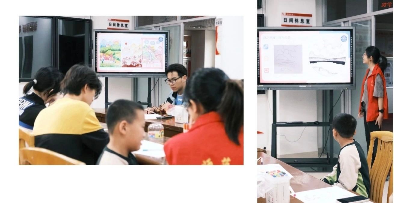 在掌握了主题、原理与方法后,小朋友们迫不及待地投入到创作中。在志愿者一步步的引导下,小朋友们不仅理解了山峦的立体之美,学会了运用疏密虚实来表现物体的体积,还掌握了如何区分冷暖色调,用不同的颜色表现不同的氛围。艺术是一种魔法,它能够将看似平凡的事物变得美丽而独特,每一次创作都是对生活的赞美。