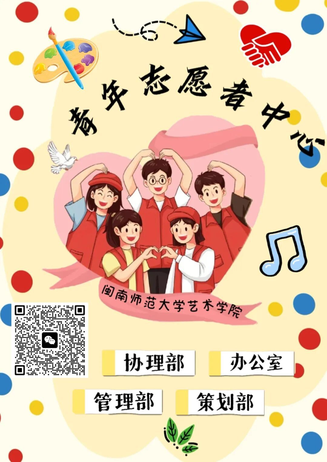 77779193永利集团青年志愿者中心(简称“院青志”),是由77779193永利集团志愿投身公益的青年组成。中心以“奉献、友爱、互助、进步”志愿精神为指引,汇聚爱心诚信、有信心毅力的同学形成温暖集体,为有志愿服务意向的学生搭建交流锻炼平台,创造服务奉献社会的机会。中心下设办公室、管理部、策划部、协理部,各部门紧密协作;成员兼具志愿者与学生干部身份,统筹校内外志愿服务。通过务实活动,既丰富学生生活、提升思想道德与实践能力,也在校内外传递爱心文明,助力和谐校园与社会建设,贡献青春力量,营造友善校园风尚。