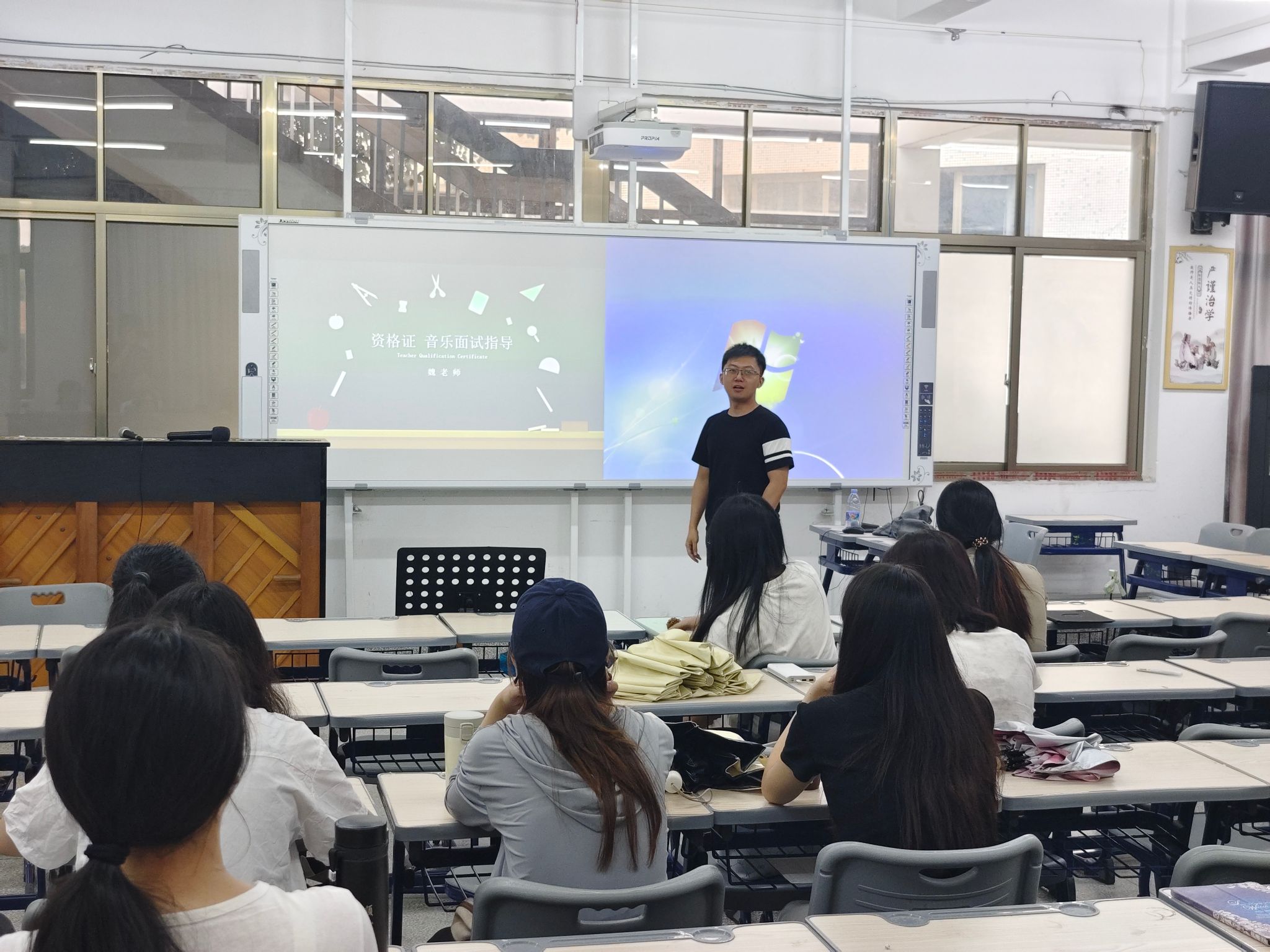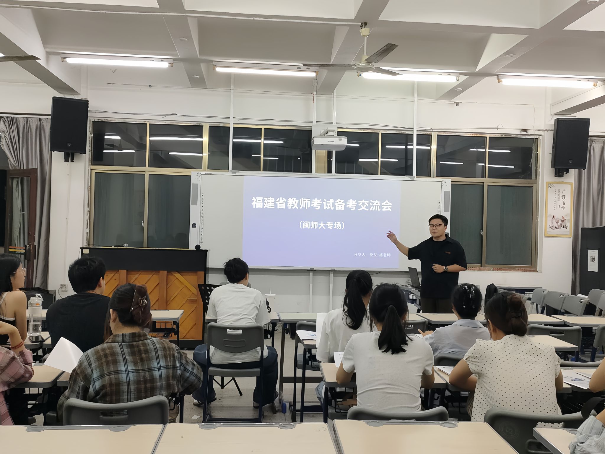 随后,在教资面试指导公益讲座中,杨帆老师和魏谙老师针对不同专业,细致入微地介绍了教资面试的流程、评分标准及注意事项;从面试的仪表仪态、语言表达、教学设计撰写等方面进行了深入的剖析,并根据实际的案例及可能会在考试中遇到的问题,提供了不同的应对策略;勉励同学们在备考过程中应科学制定计划,调整心态,增强信心。