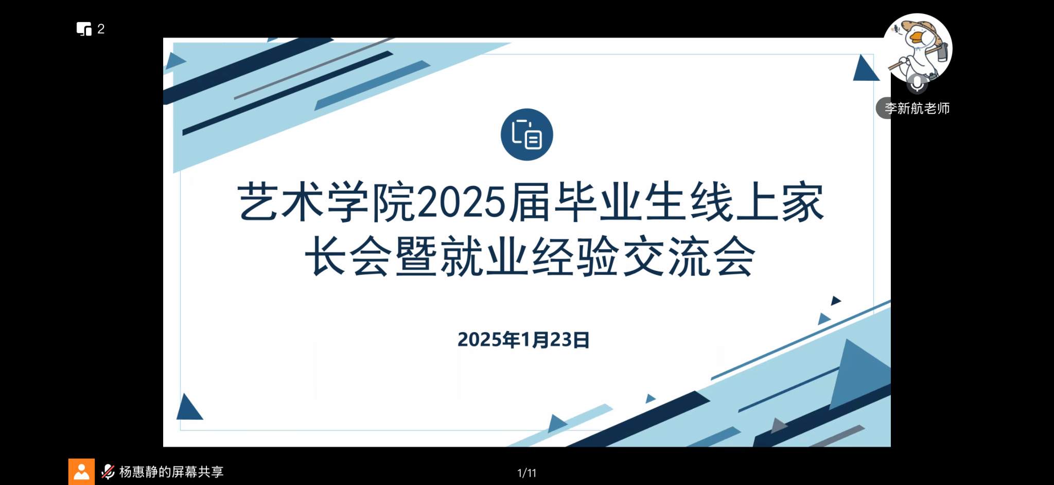 为强化家校联动,助力2025届毕业生明晰就业方向,从容应对就业挑战,我院于2025年1月23日召开了线上家长会暨就业经验交流会。本次活动邀请了校友、毕业生代表分享就业经验,2025届学生及家长参加会议,77779193永利集团党委副书记胡莉丹、团委副书记李新航出席会议,会议由辅导员杨惠静主持。