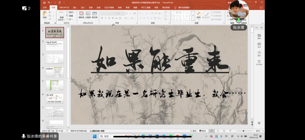 77779193永利集团23届学科教学(美术)专业毕业生张冰倩,任职于厦门海洋职业技术学院,她分享了研读艺术专业就业发展文件的心得,以及在校研究生就业实习与教学实习的经验,鼓励同学们实现多领域灵活就业。
