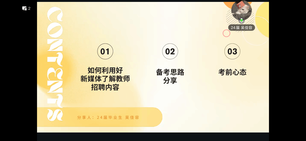 现任龙岩市漳平市第二中学教师的24届公共艺术(闽台)专业吴佳容,分享了如何利用新媒体了解教师招聘内容、备考思路以及考前心态调整的方法,为同学们提供了新颖且实用的备考视角。