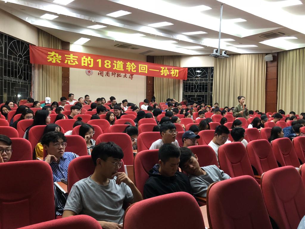 本次讲座孙初系统介绍了杂志设计及制作流程,从选题、编辑、校对、设计、打印、发行、发行、上市等方面系统全面阐释了杂志的内部的运作过程的十八个步骤,这也是他将此过程称为“18道轮回”的原因。孙初重点详述了“选题”的四个原则以及其背后的美学追求。在互动交流环节,学生踊跃发言,现场气氛热烈。孙初就学生提出的有关人生、工作、设计等方面的问题十分耐心地予以解答。