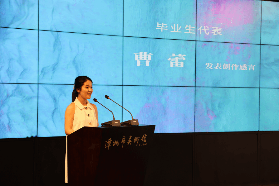 2025届美术与设计系毕业生代表曹蕾在发言中表示,本次展览中的每一件作品都承载了四年专业学习的积累与沉淀,凝聚着老师和同学们辛勤的汗水,在即将毕业之际,她代表全体毕业生真诚地感谢学院领导和老师对他们的关心和培养。